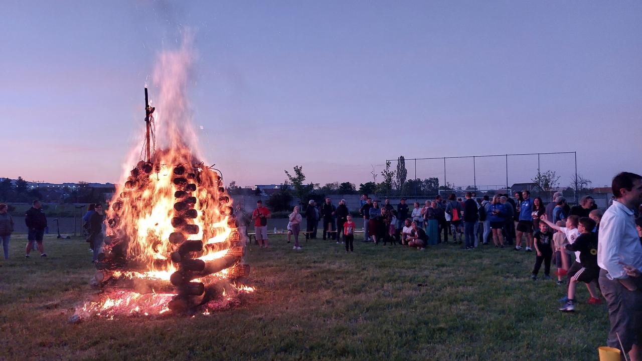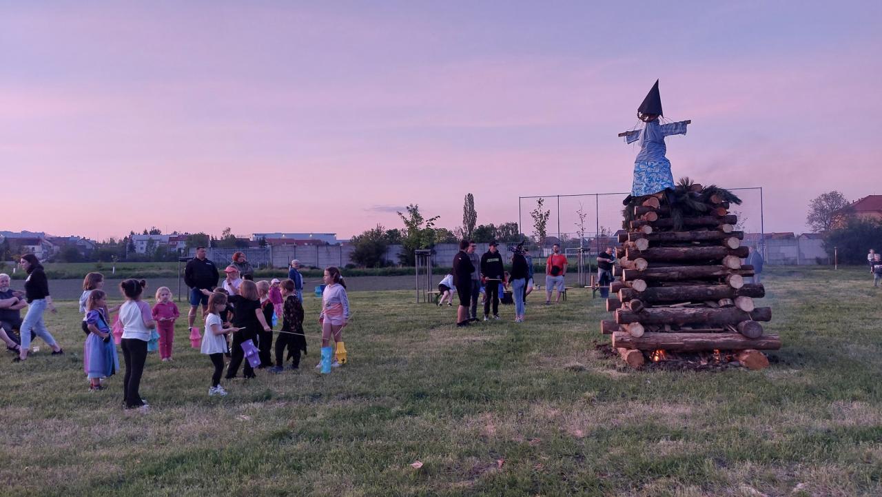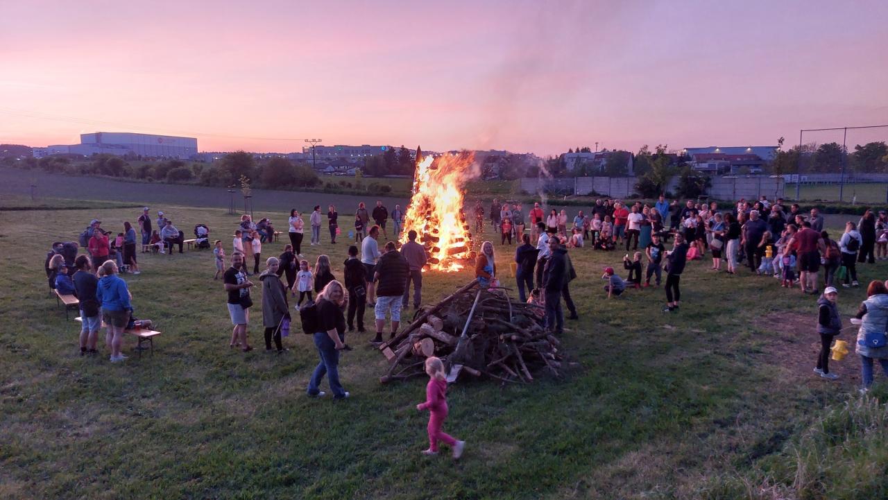 Po příchodu dětí s lampiony k postavené hranici, byla při začínajícím soumraku hranice úspěšně zapálena a u ohně pak bylo možné posedět dlouho do noci...